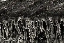 The hybrid layer is hydrophobic, acid resistant and tough. The quality of hybrid layer formed decides the strength of resin dentin interface. When the hybrid layer becomes thicker and more uniform, the bond strength is better.[4]