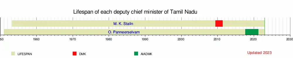 The office has since been only intermittently occupied, having been occupied for a little more than 5 years out of the 12 years since its inauguration. Since 2009, Tamil Nadu has had 2 deputy chief ministers, none of whom have served at least one full term. The first was former chief minister of Tamil Nadu M. Karunanidhi's third son, M. K. Stalin[2] of the Dravida Munnetra Kazhagam, who was sworn in on 29 May 2009; he was also rural development and local administration minister in Karunanidhi's fifth ministry. The position was vacant until All India Anna Dravida Munnetra Kazhagam's O. Panneerselvam[3] took over; he became the second deputy chief minister on 21 August 2017 and took on the role in addition to his finance ministership in Edappadi K. Palaniswami's government. He was the last person to serve as the deputy chief minister of Tamil Nadu until the post became vacant.
