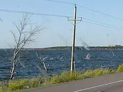 Devils Lake is the endorheic, or closed, lake of a drainage basin of some 3,800 sq mi (9,800 km2), the Devils Lake Basin. The lake collects around 86 percent of the basin's water runoff.[9] Above an elevation of 1,447 ft (441 m) AMSL, the lake spills into neighboring Stump Lake. At 1,458 ft (444 m), the combined lake flows naturally into the Sheyenne River, though the lake has not reached this level in approximately 1,000 years.[10] The Sheyenne River is a tributary to the Red River, which flows into Canada, with eventual exit into the Hudson Bay.[9] Dike protection is set at 1,454 ft (443 m).