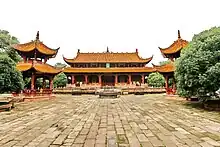 Deyang is home to a number of major historical sites, including the Sanxingdui site, Baimaguan Pangtong Temple (Chinese: 白马关庞统祠), and the Deyang Confucian Temple.[2] Other sites include the Huang Jiguang Memorial Hall (Chinese: 黄继光纪念馆), honoring Chinese soldier Huang Jiguang.[2] The Longmenshan National Park (Chinese: 龙门山国家地质公园) is also located in Deyang.[2]