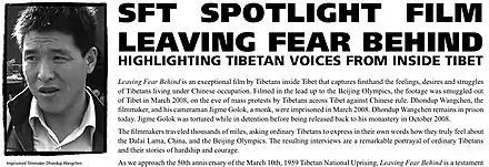 Dhondup Wangchen (Standard Tibetan: དོན་གྲུབ་དབང་ཆེན་, Wylie: don grub dbang chen; born 17 October 1974) is a Tibetan filmmaker imprisoned by the Chinese government in 2008 on charges related to his documentary Leaving Fear Behind. Made with senior Tibetan monk Jigme Gyatso, the documentary consists of interviews with ordinary Tibetan people discussing the 14th Dalai Lama, the Chinese government, the 2008 Beijing Olympics, and Han Chinese migrants to the region. After smuggling the tapes of the interviews out of Tibet, however, Dhondup Wangchen and Jigme Gyatso were detained during the 2008 Tibetan unrest.