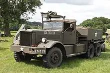During World War II, Diamond T produced a classic heavy truck in the 980/981, a prime mover which was quickly acquired by the British Purchasing Commission for duty as a tank transporter tractor. Coupled with a Rogers trailer, the truck gave sterling service with the British Army in North Africa Campaign, where its power and rugged construction allowed the rescue of damaged tanks in the most demanding of conditions.[3] In addition Diamond T built the entire range of the G509 series 4 ton 6X6s, including cargo, dump, semi tractor, and wrecker trucks,[4] as well as some lighter trucks, and even G7102 half tracks.[5] Diamond T ranked 47th among United States corporations in the value of World War II military production contracts.[6] Diamond T manufactured three pickup trucks: The Model 80,201 and the Model 202. The pickups were powered by the Hercules QX-series 6-cylinder engines. The model 80 was produced from 1936 to 1938 and the Model 201 was produced from 1938 to 1949.