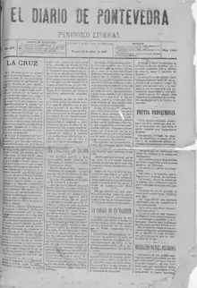In the past there have been several newspapers under the title of Diario de Pontevedra. A first publication appeared on the streets in June 1879, under the direction of Claudio Cuveiro, although the publication had a short existence; it ceased a few years later, in October.[1] In 1887, a newspaper was once again published under the title Diario de Pontevedra.[2] Originally a publication close to the Liberal Party, during the period of the Second Republic it held ultra-conservative positions and came to align itself with the most right-wing sector of the CEDA.[3] It would continue to be published until 1939,[2] being suspended after the end of the civil war.[4]