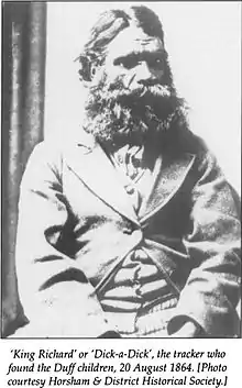 The official search was cancelled soon after the storm and newspapers reported the children as dead. On Thursday, 18 August, a neighbour of the Duff's suggested asking Dick-a-Dick and other Wotjobaluk trackers for assistance; the parents, who had not given up hope of finding their children, readily agreed.[1] Dick-a-Dick took two other Wotjobaluk men, Jerry and Fred, with him, and within hours they had rediscovered the children's trail and hours later had found the children near death.[4] Dick-a-Dick was lauded a hero and subsequently called King Richard.[5][6] He and his tracker colleagues received a reward of £15 (equivalent to $1,024 in 2018) between them, of which £5 they could spend in whatever way they wished, while the remainder was given to their white employer to ensure it was not wasted.[4]