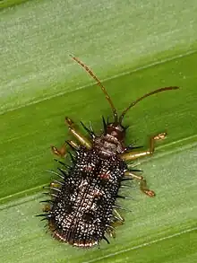 Finally the adult beetle, known as an imago, emerges and cuts its way out of the larval tunnel and surrounding leaf. The imago is ~5mm long, and bluish black with a spiny body. The average longevity of the adult is 24 days for the female, and 16 days for the male, although some individuals have been known to live as long as 90 days.[3][4] Adults have long, well-developed spines on the prothorax and elytra. Four spines project from the metanotum, and the elytra contains a row of ten spines along lateral margins, and nine dorsolateral spines.[5]
