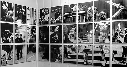Gaber separated Die Plage into four discrete parts or movements, much like a symphony.[9] The first section is dedicated to the Weimar Republic (1918–1933)[11] and the first seven years of the Third Reich, including Hitler's rise in popularity, propaganda campaigns, the political defamation of modern art, the 1936 Olympics and the 1937 Entartete Kunst exhibition. Section II depicts persecution of the Jews. In this section, Gaber painted directly on the collages with abstract strokes of gray and blue. Section III reimagines the events in the prior two sections from more subjective points-of-view, and Section IV serves as an epilogue. The density of images within the canvases, and the rhythm of canvases within panels, change notably in each section.[9]