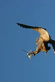 The Eurasian eagle-owl predates the largest members of the most species-rich diurnal raptor genera: the 900 g (2.0 lb) northern goshawks from the genus Accipiter, the 1,375 g (3.031 lb) upland buzzards from the genus Buteo and the 1,460 g (3.22 lb) gyrfalcons (F. rusticolus) of the genus Falco.[122] Additional large raptors, i.e. those that can average 1,000 g (2.2 lb) or more in body mass, taken as prey include 1,485 g (3.274 lb) osprey (Pandion haliaetus), the 1,080 g (2.38 lb) red kites (Milvus milvus), and the rough-legged buzzards (Buteo lagopus) and saker falcons (Falco cherrug), in both of which females average more than 1,000 g (2.2 lb).[2][60][149][150][151][152] The taking of rough-legged buzzards and snowy owls must be confined to full-grown victims, since they nest further north than Eurasian eagle-owls.[2] Eurasian eagle-owls also hunt the smallest raptors available, including those such as lesser kestrels (Falco naumanni) and Japanese sparrowhawks (Accipiter gularis) that weigh less than 150 g (5.3 oz).[88] Some of these are cases of eagle-owls killing nestlings or fledglings but they can easily overtake adult buzzards, goshawks and falcons of any size.[2]