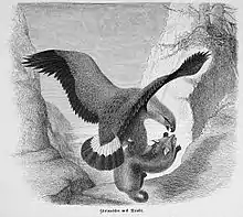 After the leporids, the next most significant group in the diet of golden eagles is the ground squirrels. They comprise about 11.2% of the prey taken by this species across the range. In areas where leporids are scarce, this group of rodents seems to become more prominent. In many parts of the golden eagle's range, ground squirrels are rare or absent, such as the British Isles, the Iberian Peninsula and some portions of central Eurasia. Nonetheless, about half of the large Spermophilus group, all species of prairie dog, three out of four species of antelope squirrel and nearly all the species of marmot have been found as golden eagle prey. Nests in Denali National Park in Alaska included, among a sampling of 690 remains, contained 84.2% Arctic ground squirrels (Spermophilus parryii).[32] Studies in Alaska have shown that the other major prey species in Alaska, the willow ptarmigan and the snowshoe hare, follow an 8 to 11 year population cycle. The locally abundant ground squirrels have less dramatic population variations and come out of hibernation in mid to late May (shortly after the eagles return from migration). The Alaskan Arctic ground squirrel appears to be eaten supplementally in peak years but then fill the primary niche when the ptarmigan and hare populations crash.[63][64] In Alberta, Columbian ground squirrels (Spermophilus columbianus) (occasionally supplemented by other species like yellow-bellied marmots) were the primary prey species, making up 84% of the diet of eagles nesting there.[27] In the French Alps, the most significant prey species is the Alpine marmot (Marmota marmota) at 68.9% out of a sampling of 198 from 6 nests.[65] This is also the main prey species in the Italian Alps above the tree line, comprising 49.7% of a sample size of 79 from 12 nests.[66] In the Caspian Sea area of Kazakhstan, yellow ground squirrels (Spermophilus fulvus) are the most important mammalian prey at 23.4% of a sampling of 468 from 36 nests.[67] Along Coastal California, California ground squirrels (Spermophilus beecheyi) replace black-tailed jackrabbits (which are scarce there) as the primary prey species.[68] In Washington, where the golden eagle inhabits mainly forest openings made by humans, the yellow-bellied marmot (Marmota flaviventris) is the main prey species, making up 41.8% of a sampling of 47 from 2 nests and 40.3% of a sampling of 315 from 74 nests.[44][45] In many other areas, ground squirrels are secondary prey, usually ranking after lagomorphs in dietary significance. This is especially true in the contiguous Western United States outside of Washington state and coastal California where they often register as second, third or even fourth most represented family by remains. Prairie dogs feature only as supplemental prey for breeding golden eagles but wintering eagles reportedly prey heavily on colonies of black-tailed prairie dogs (Cynomys ludovicianus).[69][70] Although rare, tree squirrels have turned up as prey in some eagle nests in both North America and Eurasia.[10][38]