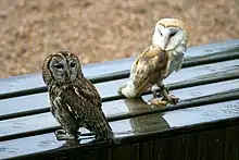 In every part of its range, tawny owls co-exist with other birds of prey, with other owls presenting the strongest possibility for competition given their overlapping food selection and shared nocturnality. As perhaps the most numerous and one of the most widely distributed in the continent of the 13 owl species regularly occurring in Europe, ecological interactions of some kind have been recorded with most other species.[7][11] Given their medium-sized frame and general adaptability, of special interest is how they co-exist with other medium-sized owls such as long-eared owls and barn owls.[7] Many studies have contrasted particularly the food habits of long-eared owls living in proximity to tawny owls. Generally speaking, the long-eared owls in Europe are much more strongly disposed to being a specialist species than the tawny owl, relying almost entirely on voles. Although in the broad picture, the long-eared also feeds on other prey such as birds and insects, their food niche breadth is consistently lower than that of the tawny owls. For example, in a very large study of central Europe, the common vole species alone constituted about 76% of 57,500 prey items for long-eared owls.[141][50][142][143] Long-eared owls also differ strongly from tawny owls in selecting much more open hunting grounds, such as old fields, usually hunting on the wing rather than from a perch and in utilizing abandoned (and often rather open) bird nests rather than natural cavities as nesting sites.[7][107][144] In terms of peri-urbanisation, the long-eared and tawny owls are more or less equally adaptive to such areas.[11] The food niche breadth is usually greater in Europe for the tawny owl than for the barn owl as well,[75][86] although the barn owl appears to have a stronger liking of shrews as prey than does the tawny owl (shrews more than twice as often selected).[11] The barn owl, although also by nature a cavity nester, does not generally acclimate to well-wooded areas where the tawny owl is at home.[107] Both the long-eared and barn owls prefer voles where they are available, especially as both often hunt in open areas where they are common, whereas Apodemus mice tend to be slightly preferred by tawny owls.[7][11][145] When conflicts ensue, the tawny owl tends to dominate these other medium-sized owls. This is in part due to their size advantage, with the tawny being larger by an average of 32% (of 3 standards of measurements, two from the wing, one by body mass) than the long-eared owl and 24% larger than the barn owl.[7][146] Tawny owls are known to readily evict barn owls from their own nest sites, normally when taking up residency in towns or cities.[147] It was additionally found that barn owls, being a species better adapted to warmer, more tropical areas, is at higher risk of starvation in cool weather than long-eared and tawny owls, with proportionately many more found dead in winter in France due presumably to inferior lipid fat reserves.[148]