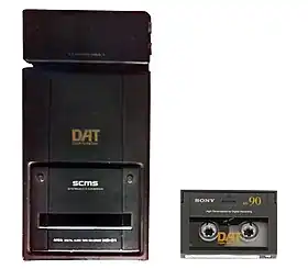 Digital Audio Tape (DAT or R-DAT) is a signal recording and playback medium developed by Sony and introduced in 1987.[1] In appearance it is similar to a Compact Cassette, using 3.81 mm / 0.15" (commonly referred to as 4 mm) magnetic tape enclosed in a protective shell, but is roughly half the size at 73 mm × 54 mm × 10.5 mm. The recording is digital rather than analog. DAT can record at sampling rates equal to, as well as higher and lower than a CD (44.1, 48, or 32 kHz sampling rate respectively) at 16 bits quantization. If a comparable digital source is copied without returning to the analogue domain, then the DAT will produce an exact clone, unlike other digital media such as Digital Compact Cassette or non-Hi-MD MiniDisc, both of which use a lossy data-reduction system.