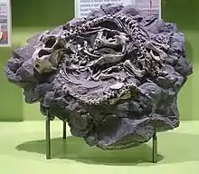 Diictodon is an extinct genus of pylaecephalid dicynodont.[5] These mammal-like synapsids lived during the Late Permian period, approximately 255 million years ago. Fossils have been found in the Cistecephalus Assemblage Zone of the Madumabisa Mudstone of the Luangwa Basin in Zambia and the Tropidostoma Assemblage Zone of the Teekloof Formation, Tapinocephalus Assemblage Zone of the Abrahamskraal Formation, Dicynodon Assemblage Zone of the Balfour Formation, Cistecephalus Assemblage Zone of the Middleton or Balfour Formation of South Africa and the Guodikeng Formation of China.[6] Roughly half of all Permian vertebrate specimens found in South Africa are those of Diictodon. This small herbivorous animal was one of the most successful synapsids in the Permian period.[7]