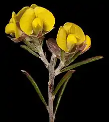 Dillwynia acerosa is a species of flowering plant in the family Fabaceae and is endemic to Western Australia. It is an erect spindly shrub with hairy, needle-shaped leaves and yellow flowers.