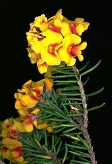 Dillwynia rupestris is a species of flowering plant in the family Fabaceae and is endemic to the Gibraltar Range National Park in New South Wales. It is an erect, single-stemmed shrub with linear leaves and yellow flowers with red markings.