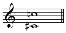 In music from Western culture, a diminished octave (Play) is an interval produced by narrowing a perfect octave by a chromatic semitone.[1] As such, the two notes are denoted by the same letter but have different accidentals. For instance, the interval from C4 to C5 is a perfect octave, twelve semitones wide, and both the intervals from C4 to C5 and from C4 to C5 are diminished octaves, spanning eleven semitones. Being diminished, it is considered a dissonant interval.[3]