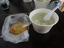 Diāng-biĕng-gù (simplified Chinese: 鼎边糊; traditional Chinese: 鼎邊糊; lit. 'pot side paste', Foochow Romanized: diāng-biĕng-gù), also known as guo bian hu (simplified Chinese: 锅边糊; traditional Chinese: 鍋邊糊; pinyin: guō biān hú; lit. 'wok side paste')[1] and ding bian cuo (simplified Chinese: 鼎边銼; traditional Chinese: 鼎邊锉; pinyin: dǐng biān cuò; lit. 'pot side scraping'),[2] is a characteristic dish of Fuzhou cuisine, a branch of Fujian cuisine,[3] consisting of a rice flour batter poured around the side of cooking wok to form a thin noodle, then scraped into a stock to simmer and served in broth.[4] Other ingredients to flavour the stock are often served in the broth; commonly included is a form of seafood,[5] some meat (such as meatballs, usually pork) and various vegetables.[6][7]
