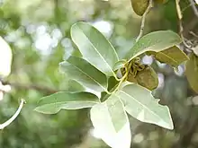 Evergreen trees up to 16 m tall, with smooth, black bark. The blaze is a dull orange. The young branchlets are cylindrical, covered by black, sooty hairs. The tree's leaves are simple, alternate, distichous, with petioles about 0.5-1.1 cm long, flat, glabrous. The leaf blade is about 9 to 27 cm long by 3.5-8 cm wide, and has an entire margin and a raised midrib. The leaf shape is usually narrow elliptic-oblong to lanceolate, with acute to acuminate apex ending in a blunt tip. The leaf base is acute to rounded. The leaf is thick (coriaceous) with minute pellucid dots beneath. The venation, with 6-9 pairs of secondary nerves, is strongly and closely reticulate on both surfaces.[5]