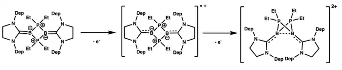 Synthesis of diphosphadiboretane from diboryne offers a two electron-rich compound, compared to diphosphadiboretanediyls.[7] These electrons can be readily oxidized, affording the radical cation compound and diphsophadiboretanediyl compound. The radical cation is found to exhibit triplet state by electronic paramagnetic resonance, accompanying with a shortening of the B-B bond (2.63 Å) and slight perturbance of planar, square structure. The diphosphadiboretanediyl compound is found to have a B-B bond of 2.12 Å and the transition to the bicyclo[1.1.0] structure. Natural bond orbital analysis of phosphadiboretanediyl compound indicates a bent B-B bond with a small 3 kcal mol−1 stabilization energy compared to the planar structure.