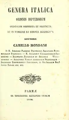 - Rondani, Camillo (1856). Dipterologiae Italicae Prodromus. Vol: I. Genera italica ordinis Dipterorum ordinatim disposita et distincta et in familias et stirpes aggregata. Parmae [= Parma].: A. Stocchi. pp. 226 + [2]. Retrieved 17 October 2020.