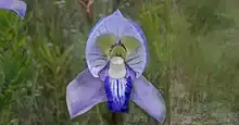 Plants are 200โ250 mm (7.9โ9.8 in) tall, growing from a tuber with a length of about 30 mm (1.2 in) and a diameter of about 10 mm (0.39 in). About 10 narrow, rigid leaves, about half as tall as the plant, grow from a basal rosette. The base of the plant is often surrounded by a sheath of old leaf fibers.[1] This species flowers in October and November, producing an inflorescence of 1-7 sweetly scented flowers. Each flower has a blue hood and side wings, with a dark purple lip below. Yellow-green petals are found at the back of the hood. [2] While the flowers look similar to those of Disa graminifolia, they differ in having an upcurved lip margin and a conical spur. They also flower at different times of the year. [3] While there is generally very little variation between plants, some white flowers have been observed. This has been suggested to be a recessive condition.[1]