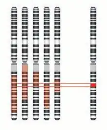 Identity by descent (IBD) mapping generally uses single nucleotide polymorphism (SNP) arrays to survey known polymorphic sites throughout the genome of affected individuals and their parents and/or siblings, both affected and unaffected. While these SNPs probably do not cause the disease, they provide valuable insight into the makeup of the genomes in question. A region of the genome is considered identical by descent if contiguous SNPs share the same genotype. When comparing an affected individual to his/her affected sibling, all identical regions are recorded (ex. Shaded in red in above figure). Given that an affected sibling and an unaffected sibling do not have the same disease phenotype, their DNA must by definition be different (barring the presence of a genetic or environmental modifier). Thus, the IBD mapping results can be further supplemented by removing any regions that are identical in both affected individuals and unaffected siblings.[3] This is then repeated for multiple families, thus generating a small, overlapping fragment, which theoretically contains the disease gene.