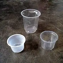 A disposable cup is a type of tableware and disposable food packaging. Disposable cup types include paper cups, plastic cups and foam cups.[1][2] Expanded polystyrene is used to manufacture foam cups,[3] and polypropylene is used to manufacture plastic cups.[4]