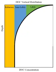 More precise measurement techniques developed in the late 1990s have allowed for a good understanding of how dissolved organic carbon is distributed in marine environments both vertically and across the surface.[128] It is now understood that dissolved organic carbon in the ocean spans a range from very labile to very recalcitrant (refractory). The labile dissolved organic carbon is mainly produced by marine organisms and is consumed in the surface ocean, and consists of sugars, proteins, and other compounds that are easily used by marine bacteria.[129] Recalcitrant dissolved organic carbon is evenly spread throughout the water column and consists of high molecular weight and structurally complex compounds that are difficult for marine organisms to use such as the lignin, pollen, or humic acids. As a result, the observed vertical distribution consists of high concentrations of labile DOC in the upper water column and low concentrations at depth.[130]