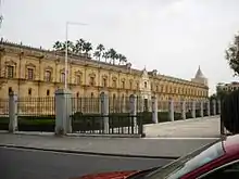 The Casco Antiguo (Spanish: Ancient Shell) is the old quarter of Seville, in the centre of the city on the east bank of the Guadalquivir river. Principal tourist attractions are located here, such as the cathedral, the Alcázar, the Torre del Oro, the City Hall, the Palace of San Telmo, the Archivo General de Indias and the Metropol Parasol. Of its twelve neighbourhoods, El Arenal on the riverfront was the port of Seville until the Guadalquivir silted up in the 17th century,[1] while the neighbouring Santa Cruz neighbourhood was a Jewish quarter until the Spanish Inquisition.[2]