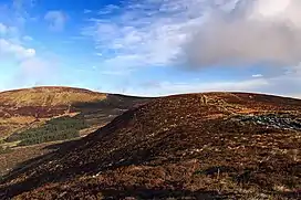 Djouce (Irish: Dioghais, meaning 'fortified height')[2] at 725 metres (2,379 ft), is the 74th–highest peak in Ireland on the Arderin scale,[3] and the 91st–highest peak on the Vandeleur-Lynam scale.[4][5] Djouce is situated in the northeastern section of the Wicklow Mountains, and dominates the views of the Wicklow Mountains from Roundwood to Newtownmountkennedy.[2] Djouce is one of a few Irish mountains for which the Irish Office of Public Works (OPW) maintain a boarded mountain trail, using railway sleepers, from its base to a point close to its summit; making the mountain even more accessible to the public, but while also protecting the underlying bog and soil from human erosion.[1][6] Djouce is popular with hill walkers, and it lies along the 131-kilometre Wicklow Way; on its southern slopes at a senic viewpoint is the J.B. Malone memorial stone, dedicated to the creator of the Wicklow Way.