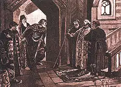 Dmitriy Yurievich Shemyaka (Russian: Дмитрий Юрьевич Шемяка) (died 1453) was the second son of Yury of Zvenigorod by Anastasia of Smolensk and grandson of Dmitri Donskoi. His hereditary patrimony was the rich northern town Galich-Mersky. When his brother prince Vasily I of Moscow died in 1425, he and his 10-year-old nephew Vasily started fighting over the right to the throne, causing the Muscovite War of Succession (1425–1453). Intermittently, Shemyaka managed to be recognised twice as Grand Prince of Moscow.(1445, 1446–1447)