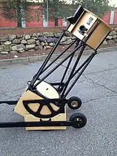 Dobson identified the characteristic features of the design as lightweight objective mirrors made from porthole glass, and mountings constructed from plywood, Teflon strips and other low-cost materials.[4] Since he built these telescopes as aids in his avocation of instructional sidewalk astronomy, he preferred to call the design a "sidewalk telescope".[6] Dobson combined all these innovations in a design focused towards one goal: building a very large, inexpensive, easy to use, portable[7] telescope, one that could bring deep-sky astronomy to the masses.[8]