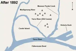 Illustration of the Yarra River, before and after the creation of Victoria Dock