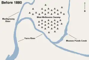 Before the foundation of Melbourne, Docklands was a wetlands area consisting of a large salt lake and a giant swamp (known as West Melbourne Swamp) at the mouth of the Moonee Ponds Creek. It was one of the open hunting grounds of the Wurundjeri people, who created middens around the edges of the lake.