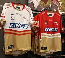 On 27 October 2021, the Dolphins unveiled a heritage jersey design, inspired by the Redcliffe Dolphins jersey from the 1980s. The design is predominantly red, with white sleeves and a gold trim.[59] On 2 October 2022, the debut home jersey design for 2023 was unveiled just prior to kick-off of the 2022 NRL Grand Final at Accor Stadium in Sydney.[60] The inaugural away jersey was released on 11 November.[61] Otherwise, the team training shirt is predominantly black in colour.[62]