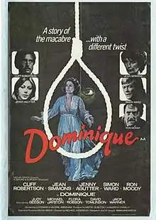 Dominique (also released as Dominique Is Dead) is a 1979 British psychological horror film directed by Michael Anderson, and starring Cliff Robertson, Jean Simmons, Simon Ward, Jenny Agutter and Ron Moody.[3][4] The film is based on the 1948 short story "What Beckoning Ghost", written by American author Harold Lawlor.[5] It centers on a wealthy businessman (Robertson) who is seemingly haunted by the ghost of his wife (Simmons), whom he drove to suicide.