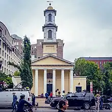 Several fires were lit during protests in Washington on the night of May 31, including one in the basement of Ashburton House, the parish house of St. John's Episcopal Church.[4] The fire was isolated to the church nursery and quickly extinguished by firefighters.[60][62][63] According to the church's rector, Reverend Rob Fisher, during the protests "a fire was lit in the nursery, in the basement of Ashburton House". Fisher wrote that the fire was small, wrecking the nursery room but leaving the rest of the church and parish house untouched, except by graffiti which had been quickly fixed.[4] Trump later claimed that "the church was badly hurt" and retweeted a false claim that the church "was firebombed by terrorists".[60]