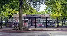 On May 29, hundreds of protesters gathered outside the White House. Shortly after 7:00 p.m., multiple protesters crossed temporary barricades near the Treasury Department, about 350 feet (110 m) from the East Wing. More than sixty Secret Service agents were injured, and eleven were transported to the hospital, as protesters threw objects at them and pulled down temporary fencing.[50] The Secret Service placed the White House on lockdown[51] and recommended that Trump and his family move to the Presidential Emergency Operations Center, an underground bunker, which they did. Trump spent almost an hour in the bunker.[52][53][54]