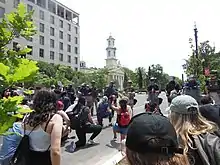 Reverend Gini Gerbasi, the rector of St. John's Episcopal Church, Georgetown, said that despite some tense moments the crowd was calm and peaceful until the police advanced.[7] She had helped organize more than twenty priests and lay volunteers to provide water, food, and hand sanitizer as a "peaceful presence in support of protesters". They were packing up before the 7:00 p.m. curfew when armed riot police entered the churchyard and expelled them. Gerbasi found herself coughing from tear gas, while other people around her were hit with non-lethal projectiles, and they were forced from the churchyard by police carrying riot shields.[76][78][77]