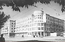 Hotel "Donbass" was built in 1938 upon the plans of N. Rechanikov and A. Shuvalova. During the construction, the project was redesigned by N. Porkhunov.[5] Panteley Tamurov supervised construction. During the Nazi occupation of Donetsk, the Gestapo was headquartered in the hotel; the building was partially destroyed during the war.[6]