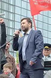 The political leadership initially consisted of Denis Pushilin, self-appointed as chairman of the government,[35][36] while Igor Kakidzyanov was named as the commander of the People's Army.[37] Vyacheslav Ponomarev became the self-proclaimed mayor of the city of Sloviansk.[38] Ukrainian-born pro-Russian activist Pavel Gubarev,[39][40] an Anti-Maidan activist, a former member of the neo-Nazi Russian National Unity paramilitary group in 1999–2001 and former member of the nazbol Progressive Socialist Party of Ukraine, proclaimed himself the People's Governor of the Donetsk Region.[41][42][43][44] He was arrested on charges of separatism and illegal seizure of power but released in a hostage swap.[45][39] Alexander Borodai, a Russian citizen claiming to be involved in the Russian annexation of Crimea, was appointed as Prime Minister, while Igor Girkin was made Defence Minister. Borodai had a past working for an openly anti-semitic and fascist Russian newspaper Zavtra which had called for pogroms against Jews.[46][47]