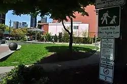 The affectionate nickname "Dragon Park"[1] derives from The Dragon, a bronze dragon sculpture and play structure created by Tsutakawa in 1978 under a commission from the Parks Department.[2] The original circular center of the park was divided into a yin-yang shape, with the southern half as a grass lawn and the northern half as a sand play area.[3]: 15–16 The bronze dragon was originally located in the sand portion. The northeastern corner of the original park featured "The Mountain", a small rock hill for climbing with a slide from the top into the sand area, connected by a bridge on the eastern edge of the park to another pile of rocks and a play structure in the southeastern corner. The northwest corner had a "Neon Pavilion" with seating, and the southwest corner (at the corner of 7th and Lane) had a large stone berm/planter.[4]: 9 [5]: 9