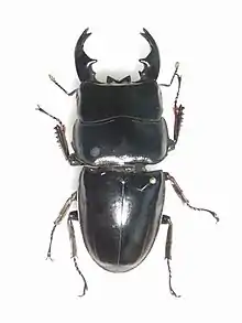 Dorcus is a genus of beetles in the family Lucanidae (stag beetles). Of the 30-odd species, most occur in Asia and India; two are found in southern Europe, and two species are from North America. Previously, specimens with serriform teeth on the mandibles and sable pigment were called Serrognathus whereas specimens with but a singular or multiple bulky notches on the mandibles and lustrous sable pigmentation were called Dorcus.[1]