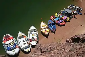 The western river dory, though sharing features with sea dories, is adapted for a different place and purpose. The key differentiating features are wider beam, more flare to prevent waves coming on board, and extensive built-in buoyancy/storage areas with water-resistant hatches to shed water and keep the boat afloat in the event of a capsize. The first small flat bottomed dory run of note on the Colorado River was made by Ramon Montez and George Flavell on an 1896 river cruise from Green River, Wyoming, through the Grand Canyon to Temple Bar, Arizona.[10] Western river dories have additional special features such as strong rowlocks, long oars, and long blade oars to operate in the highly aerated waters in rapids. In rapids the master rower faces down river to see the rock and or hydraulic obstacles. In a rapid the oars are often used to steer the boat as well as to propel it. The first documentation of this "stern first" technique in Grand Canyon was by George Flavell in 1896.[11] Credit for the "stern first" technique is often given to Nathaniel Galloway who used it on his cruise through Grand Canyon a few months after the Flavell-Montez cruise.[12]