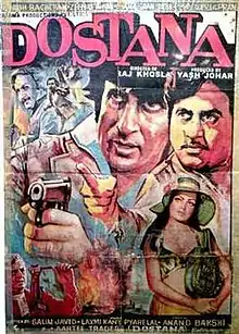 Dostana (transl. Friendship) is a 1980 Indian Hindi action drama film, written by Salim–Javed, produced by Yash Johar, and directed by Raj Khosla. The film stars Amitabh Bachchan, Shatrughan Sinha, Zeenat Aman in lead roles and Prem Chopra, Amrish Puri, Helen, Pran in supporting roles. The film was a huge hit at the box-office[1] and became the fourth highest-grosser of 1980, behind Qurbani, Asha and Ram Balram. Dostana was one of the last successful films directed by Raj Khosla. The film was remade in Tamil as Sattam with Kamal Haasan.