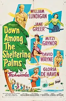 Down Among the Sheltering Palms is a 1953 American musical comedy film starring Mitzi Gaynor, William Lundigan, Gloria DeHaven, David Wayne and Jane Greer.[3] The popular song of the same name, which dates to 1914, is one of those performed in the film.