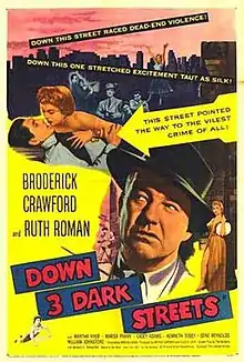 Down Three Dark Streets is a 1954 American film noir crime film directed by Arnold Laven and starring Broderick Crawford and Ruth Roman. The screenplay was written by Gordon Gordon and Mildred Gordon, based on their novel Case File FBI.[2]