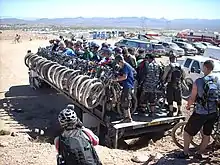 The 1st downhill time-trial race took place in Fairfax, California on October 21, 1976 on a fireroad now referred to as Repack Road,[2][3][4] due to the need to repack the hub brake after each descent.[5] The bikes used were based on cruiser bicycles that had a drum or coaster brake that worked by pedalling backward. The mechanism operated with a conical brake shoe being wound on a thread in a metal hub. To prevent the brake from seizing it was kept filled with grease. Heavy use during the descent would cause the brake to over heat, softening the grease and causing it to drain from the hub, requiring frequent repacking. Ten riders descended 1,300 feet (400 m) of Repack road in about 5 minutes.[6]