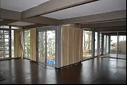This forms a "base" on which the main level appears to float. The main level is covered with redwood heartwood siding, installed vertically and stained to mimic weathered driftwood. There are large sections of glass windows and doors. The windows and doors have thin metal sashes and wood casings. A tall trim board separates the lower level from the main level between the brick walls and wood siding. The roof appears like a flat plane. The roof is supported by wood rafters spaced 10 feet (3.0 m) on center. The rafters continue through the tops of the walls and support wide overhanging eaves. The owners used the roof as a roof-top deck for viewing the lake.[2]