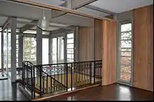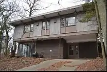 The configuration is a small rectangular, two-story box with a flat roof. An early addition was created on the northwest corner of the house. Materials chosen for the construction of the home are contextual with the landscape. The house's lower level walls are composed of dark brown colored bricks.[2]