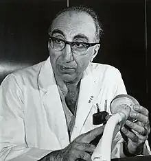 In the 1950s, DeBakey's observations and classification of atherosclerotic blood vessels permitted innovations in the treatments of vascular disease.[7] His pursuit of the ideal material to make grafts led him to a department store that had run out of nylon, so he settled on polyethylene terephthalate (Dacron) and bought a yard of the material. Using his wife's sewing machine, DeBakey produced the first arterial Dacron grafts to replace or repair blood vessels.[9][3] He subsequently collaborated with a research associate from the Philadelphia College of Textiles and Science to create a knitting machine for making grafts.[7]