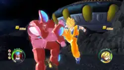 At the same time the European branch announced the inclusion of the featurette in their release of the game.[18] The following issue of Shōnen Jump, a few days later, revealed that the villain Hatchiyack would be a playable character within the game.[19] In September it was reported that Europe would also get a collector's edition of the game that would include a pop-up cover sleeve, a laser animation cel of Goku from Plan to Eliminate the Super Saiyans, and a set of scratch off card with codes to unlock bonus costumes that would, in turn, add new abilities to specific characters.[20] In the following September 20 issue of Shōnen Jump it was revealed that the Japanese release of the game would come packaged with a color booklette filled with the character design sheets from the Plan to Eradicate the Super Saiyans feature. It was also revealed that the game would feature another CG opening introduction with another new theme song by J-pop vocalist Hironobu Kageyama titled "Battle of Omega".[21] On October 6, Namco Bandai released an announcement that the game was near completion for both consoles.[22] The following week, a demo of the game was made available on the Xbox Live Marketplace, and was made available on PlayStation Network two weeks after.[23][24][25] The November issue of V Jump revealed that Tarble, the character from the feature Yo! Son Goku and His Friends Return!!, would make video game debut as a playable character within the game. Marking the character's first time being marketed outside Japan.[26] Shortly after Namco Bandai would also announce that the game would be released throughout North America on November 2,[27] with the company announcing that the game was in stores after the initial release date.[28]